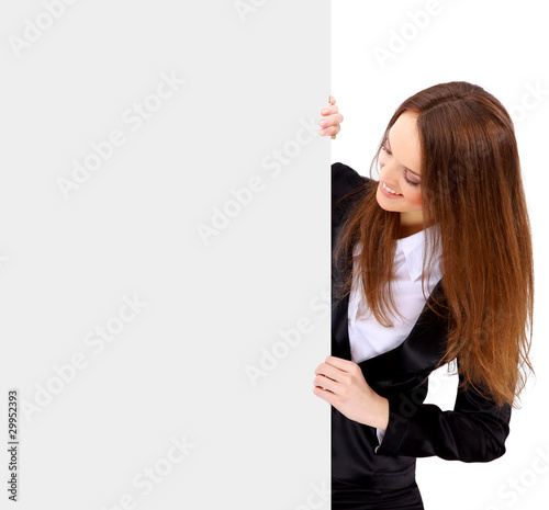 Isolate of a business woman standing beside a blank