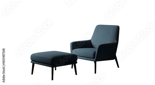 Isolated 3D Render of a Blue Chair and Ottoman with Gold Legs on Dark Background