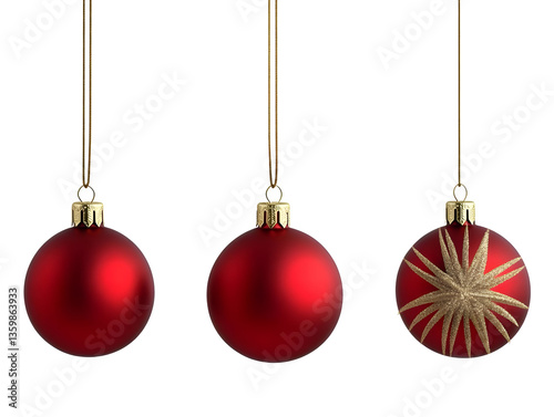 isolated, christmas, ornament, red, bauble, decoration, holiday, celebration, festive, new year, christmas, ball, hanging, shiny, decor, design, traditional, bright, elegant, season, gift, gold, sparkle, merry, object, round, still life, cut-out, studio shot, vertical, no people, transparent, background, closeup, macro, detail, texture, gold, string, group, three, seasonal, event, eve, copy space, template, graphic, card, vintage