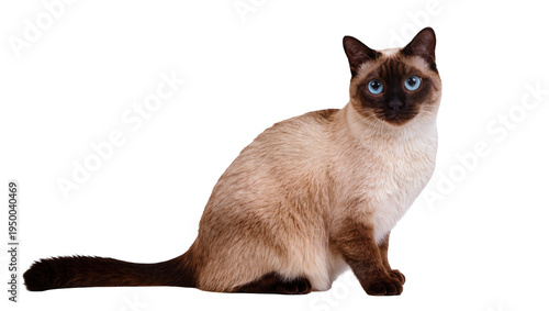 Isolated beautiful Siamese cat with stunning blue eyes sitting gracefully, looking directly at camera
