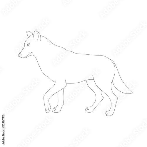 Isolated black outline cartoon standing wolf on white background. Side view line wolf. Curve lines. Page of coloring book