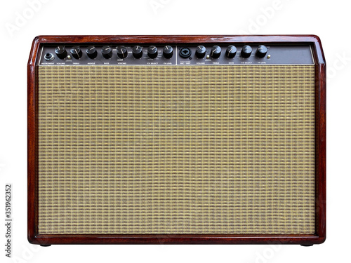 Isolated Brown mahogany wood and control panel of vintage acoustic medium guitar amplifier combo on white background with copy space and clipping path.