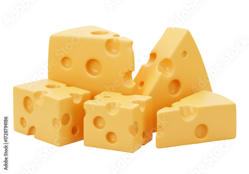 Isolated chunks of Swiss cheese, food ingredient, cheddar, snack, block of cheese, yellow cubes