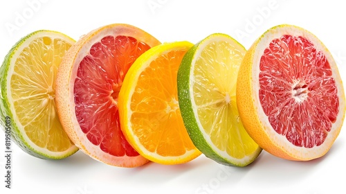 Isolated citrus fruits. Pieces of lemon, lime, pink grapefruit and orange isolated on white background, with clipping path