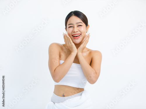Isolated cutout studio shot millennial Asian beautiful pretty sexy female model in tube cropped top shirt standing smiling holding hand on face showing presenting painting nails on white background