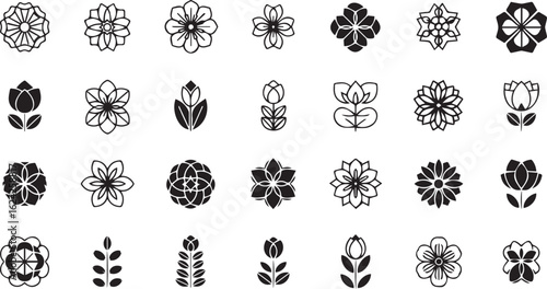 floral, flower, icon, vector, illustration, flat, design, black, white, isolated, transparent, background, set, collection, nature, plant, blossom, leaf, graphic, element, simple, clean, decorative, ornamental, symbol, logotype, pattern, abstract, geometric, modern, minimalist, artistic, stylised, shape, outline, art, drawing, botanical, garden, spring, summer, flourish, swirl, line, organic