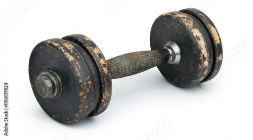 Isolated from background, old heavy beaten gym dumbbell hand weights with rubber surface. Sports, fitness, bodybuilding, wellbeing and weight lifting related isolated background