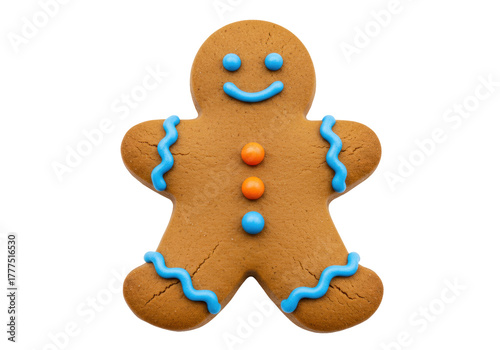 Isolated gingerbread man cookie, festive treat with blue frosting and orange candy buttons