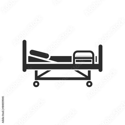 hospital, bed, icon, medicals, health care, patient, sick, disease, treatment, clinic, emergency, ward, room, furniture, equipment, symbol, signs, graphic, vector, illustration, silhouette, dark, black, white, isolated, wheeled, adjustable, headrest, rail, side, support, mattress, pillow, frame, metal, steel, health, care, disease, recovery, resting, lying, comfort, assistance, facility