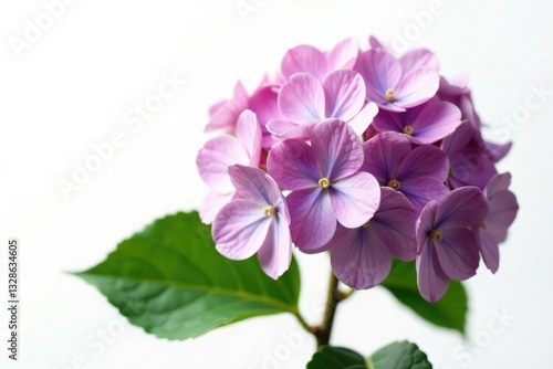 Isolated hydrangea flower on white background with soft focus and subtle lighting, floral, garden