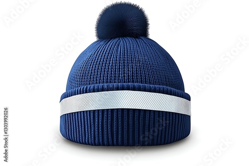 Isolated knit blue winter pom-pom hat with reflective stripe on plain white background