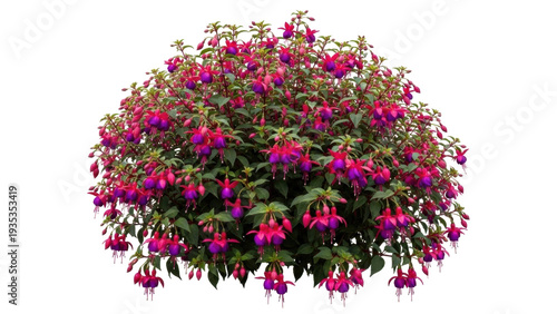 Isolated large Fuchsia bush, abundant flowering, pink and purple petals, vibrant blooms