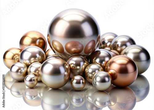Isolated metallic spheres and pearls on a white background, ideal for creative illustrations and design projects, providing a versatile and elegant visual element.
