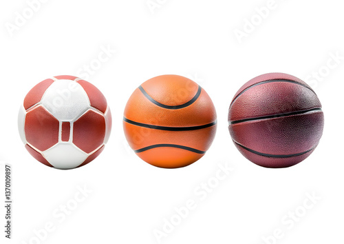 Isolated on a white background are four sports balls, including soccer, basketball, baseball, and a golf ball