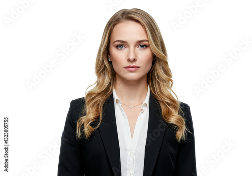 woman, young, professional, confident, serious, portrait, stylish, modern, elegant, sophisticated, beauty, strong, independent, poised, corporate, leadership, long, wavy, blond, hair, black, blazer, white, blouse, business, formal, attire, isolated, background, sharp, trendy, smart, executive