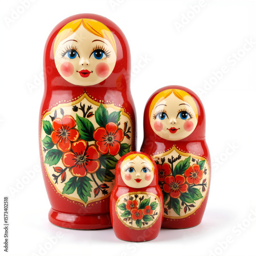 Isolated on white, three bright and funny Russian wooden nesting dolls with a bright floral pattern and a red base. Three sisters are hiding a secret surprise!