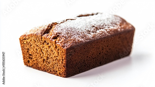 Isolated pumpkin nut bread loaf with a sprinkle of powdered sugar, placed on a clean, white background