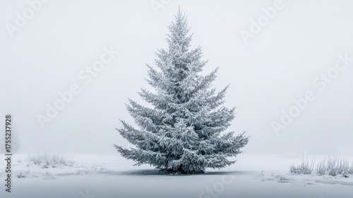 Isolated Spruce Tree Covered in Frost, Standing Alone in a Winter Landscape with Overcast Skies