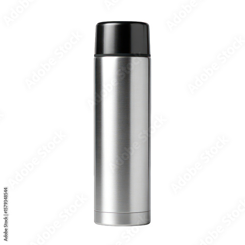 thermos, stainless steel, metal, bottle, container, beverage, isolated, thermal, travel, liquid, hot, cold, black, cap, lid, design, product, object, closeup, minimal, modern, stylish, smooth, shiny, elegant, studio shot, background, empty, space, texture, surface, cylinder, tall, vertical, clean, simple, utility, portable, insulated, stainless, metallic, reflective, bright, drink, morning, afternoon