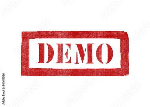 Isolated stencil text in a box with the word Demo. Old scratched red paint. Straight orientation.