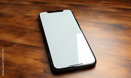 Isolated touchscreen smartphone mockup with blank screen on a wooden table