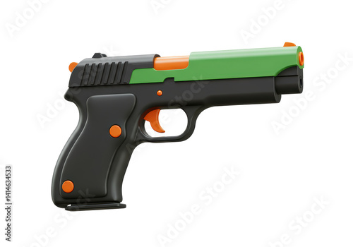 toy, gun, weapon, handgun, plastic, children, play, game, fun, orange, green, black, firearm, isolated, safety, entertainment, shooting, target, aim, replica, model, military, police, soldier, war, fight, combat, defense, protection, training, illustration, cartoon, three-dimensional, render, realistic, object, design, colourful