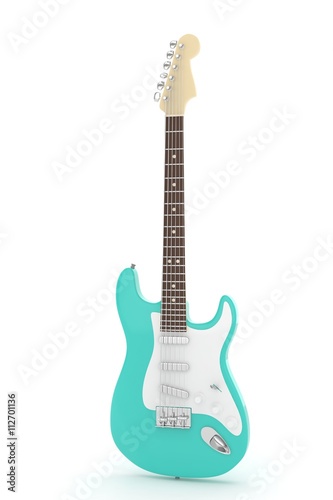 Isolated turquois electric guitar on white background. Musical instrument for rock, blues, metal songs. 3D rendering.