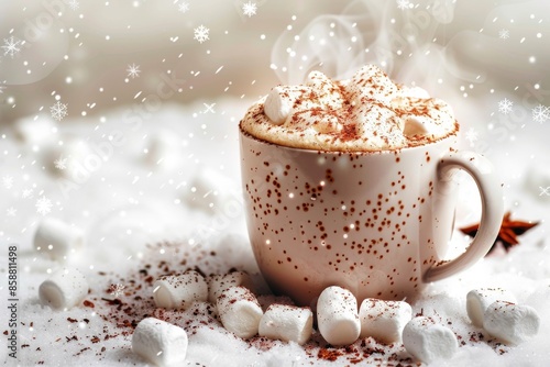 Isolated vector illustration of a steaming cup of hot cocoa with marshmallows, surrounded by snowflakes on a white background, cozy and inviting