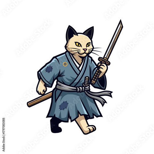 cat, samurai, warrior, sword, felino, illustration, vector, mascot, character, fighting, japanese, animal, graphic, cartoon, comic, cute, cat, traditional, kimono, robe, mediaeval, asian, determined, walking, pose, isolated, white background, patch, ragged, ready, action, emblem, culture, history, mythology, bravery, strength, legend, symbol, design element, agility, blue, beige, concept