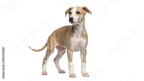 Isolated whippet puppy standing attentively, tan brindle fur with a white mask on its face