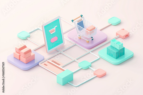 Isometric 3D Grid with Tablet, Shopping Cart, Package, and Connecting Nodes in Pastel Colors