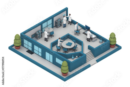 Isometric 3D illustration of a modern research laboratory with scientists working and collaborating, featuring advanced equipment and clean design. background removed