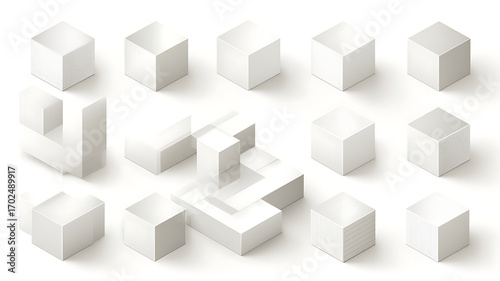 Isometric Arrangement of Abstract White Cubes on a White Background.