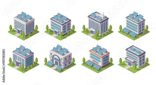 Isometric buildings with solar panels on the roof