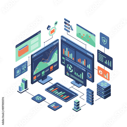 chart, graph, monitor, computer, datum, analysis, isometric, visualisation, screen, display, information, technology, digital, business, statistic, report, dashboard, interface, design, graphic, illustration, vector, blue, orange, green, colourful, modern, contemporary, trend, metric, measurement, database, server, network, connection, device, equipment, hardware, software, application, program, productivity, efficiency, insight, infographic, presentation, communication