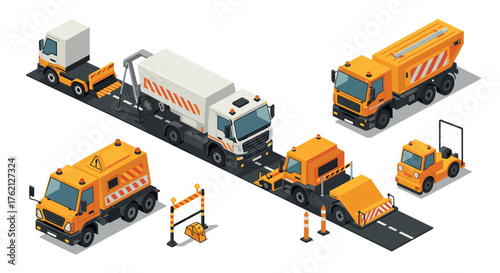 isometric, construction, vehicle, roadwork, barrier, cone, transportation, infrastructure, machinery, traffic, maintenance, safety, equipment, engineering, illustration, urban, setup, repair, industry, orange, white, logistic, highway, site, men at work, technology, modern, development, fleet, service, control, placement, outline, silhouette, design, detailed, plan