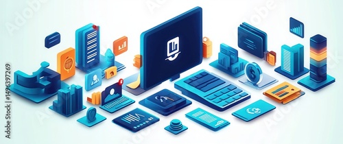 Isometric digital workspace with a variety of technology and finance-related icons and devices including laptop, smartphone, monitor, documents, charts, calculator, and currency symbols