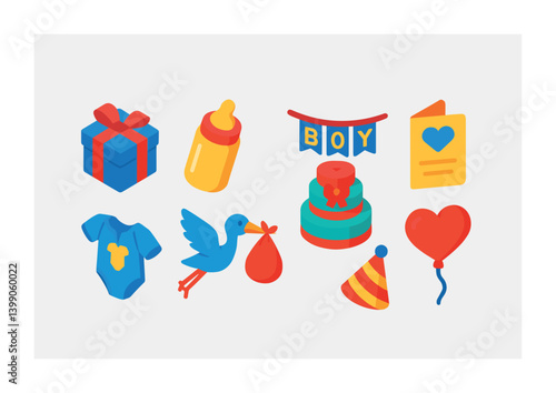 isolated, party, icon, isometric, stork, flat, bottle, nubes, banner, invitation, cake, card, baby, vector, set, icon, shower, box, gift, diaper, balloon, transparent, hat, background
