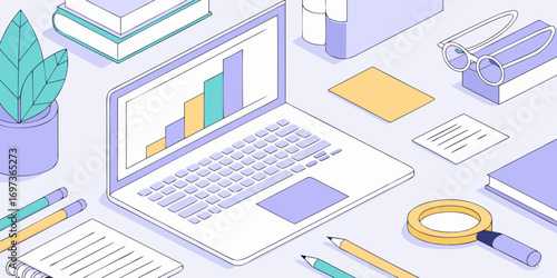 isometric, illustration, laptop, computer, desk, workspace, office, business, education, learning, study, research, analysis, datum, chart, graph, bar chart, statistic, report, document, notebook, notepad, writing, pen, crayons, magnifying glass, goggles, spectacle, plant, potted plants, book, reading, cognition, information, concept, modern, vector, graphic, digital, technology, planning, strategy, organisation, creativity, minimalist