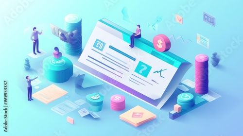 question, mark, financial, money, coin, stack, coin, dollar, currency, symbol, people, person, man, woman, sitting, standing, illustration, isometric, three-dimensional, graphic, design, business, finance, investment, growth, chart, graph, website, datum, budget, planning, strategy, solution, answer, help, support, online, digital, technology, future, abstract, concept, background, blue, purple, pink, white