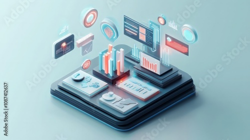 Isometric illustration of data analytics, charts, and graphs on a digital device.