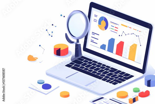 laptop, computer, screen, datum, analysis, chart, graph, business, technology, magnifying glass, finance, statistic, information, report, marketing, online, digital, concept, web, illustration, isometric, interface, diagram, research, strategy, planning, management, workspace, office, modern, creative, colourful, isolated, white background, visual, presentation, progress, success, growth, solution, optimization, dashboard, workflow, trend, innovation, communication, icon