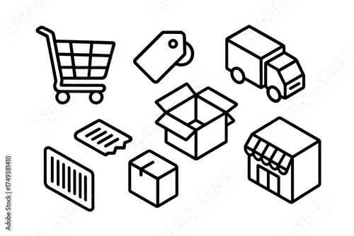 isometric, shopping, delivery, logistic, retail, business, online, symbol, line, e-business, shopping cart, truck, shipping, package, store, box, price tag, receipt, barcode, commerce, web, application, interface