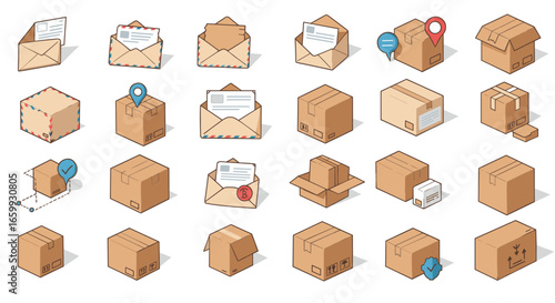 Isometric mail and package icons collection: envelopes, boxes, and delivery symbols