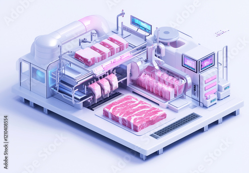 meat, processing, design, isometric, flat, colours, food, industrial, production, illustration, cardboard box, concept, factory, equipment, butcher, slaughter, cut, clean, agriculture, raw, protein, visual, kitchen, machine, technology, workflow, business, manufacturing, sanitation, work, safety, commercial, store, shop, preparation, slicing, hygiene, research, modern, graphic, caterer