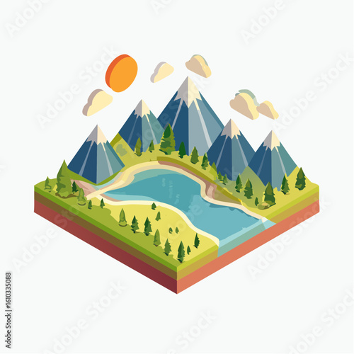 Isometric Mountain Landscape Illustration: Serene Lake, Snow-Capped Peaks, and Lush Greenery