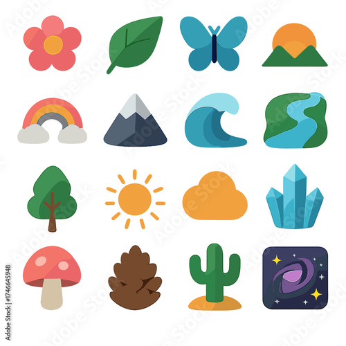 isometric, nature, icon, accent, set, flower, leaf, butterfly, sunrise, rainbow, mountain, wave, river, tree, sunburst, glowing, cloud, crystal, mushroom, pine cone, desert, cactus, cosmic, swirl, starry, sky