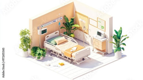 Isometric Perspective of a Hospital Room, Showcasing Bed, Medical Tools, and Plants