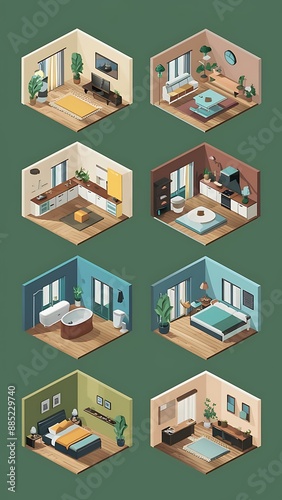 Isometric rooms. Designed house, living room kitchen bathroom bedroom toilet apartment interior with furniture 3d vector set. Kitchen isometric room