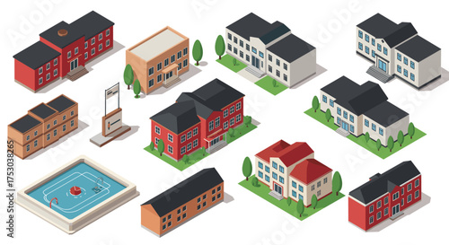 isometric, school, building, architecture, three-dimensional, education, design, facility, colourful, structure, campus, modern, traditional, collection, set, academic, exterior, complex, institution, learning, urban, style, diverse, variation, construction, detailed, infrastructure, contemporary, illustration